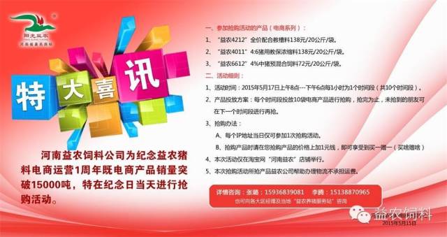 ?特大喜訊:河南益農(nóng)飼料公司為紀(jì)念益農(nóng)豬料電商運(yùn)營(yíng)1周年既電商產(chǎn)品銷量突破15000噸,特在紀(jì)念日當(dāng)天進(jìn)行***活動(dòng),具體方案如下: